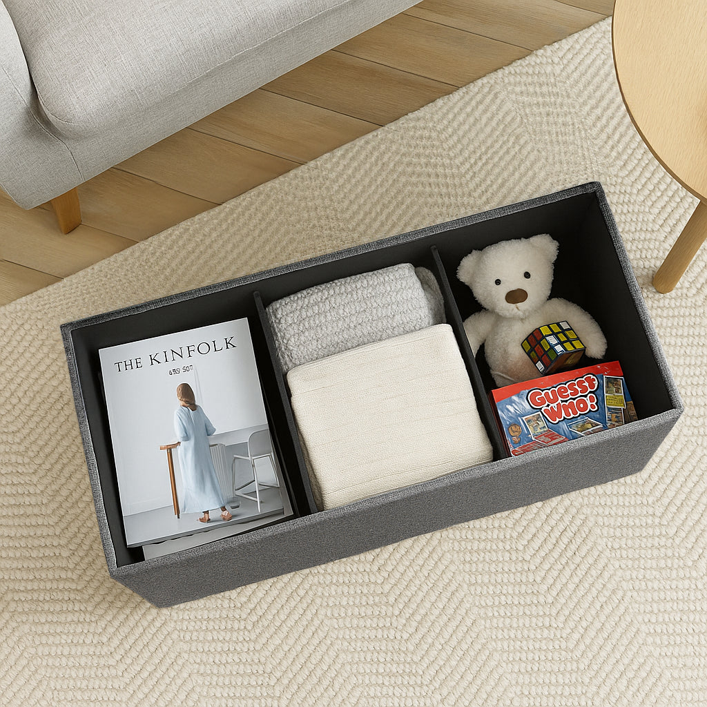The Foldable Wooden Storage Ottoman is a versatile, space-saving solution that combines practicality, style, and durability to keep your home beautifully organised.
