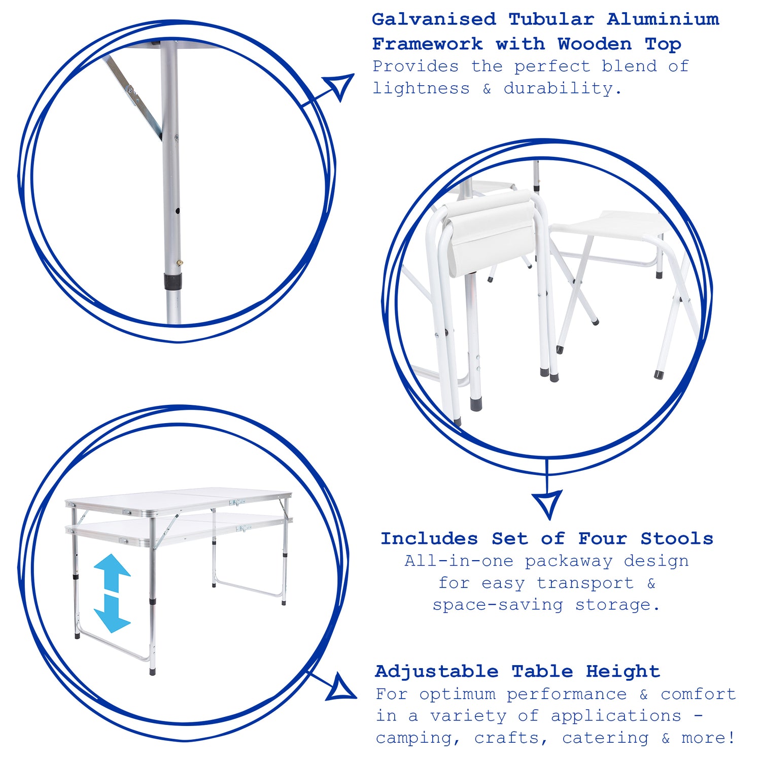 • Galvanised Tubular Aluminium Framework with Wooden Top - Provides the perfect blend of lightness and durability